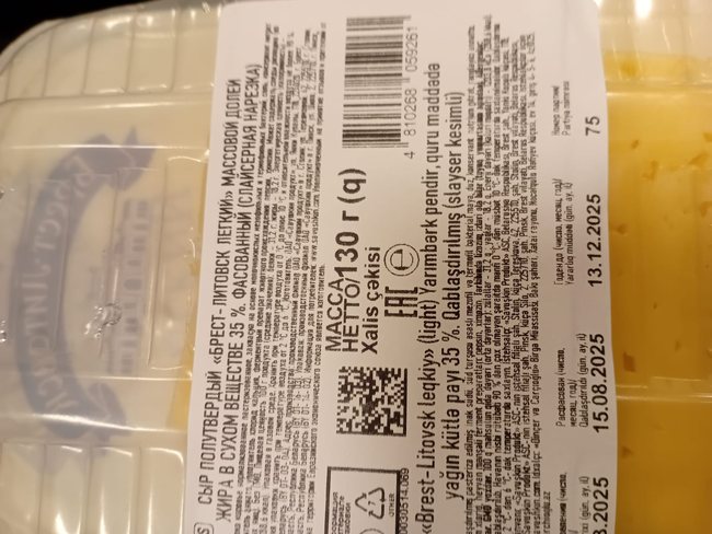 В результате проверки установлено, что в продаже находились товары с истекшим сроком годности: сыр полутвёрдый «Брест‑Литовский лёгкий», вес 130 г — 4 шт. (срок годности до 13.12.2025). Товары с деформированной упаковкой и другие нарушения не обнаружены.