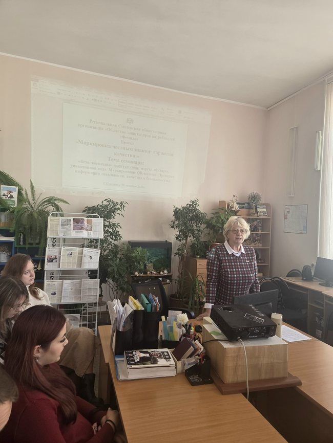 28.10.2025 г. Региональная Смоленская общественная организация «Общество защиты прав потребителей «Фемида» провела семинар на тему: «Безалкогольные напитки: соки, морсы, нектары, упакованная вода. Маркирование QR-кодами. Проверка информации легальности, качества и безопасности», в здании Смоленской областной универсальной научной библиотеки имени А.Т. Твардовского в рамках проекта «Маркировка честным знаком - гарантия качества», победителя конкурса на получения субсидии Министерства Смоленской области по внутренней политике и Фондом президентских грантов. На семинаре присутствовали 17 слушателей, которые получили знания и умение по указанной тематике.